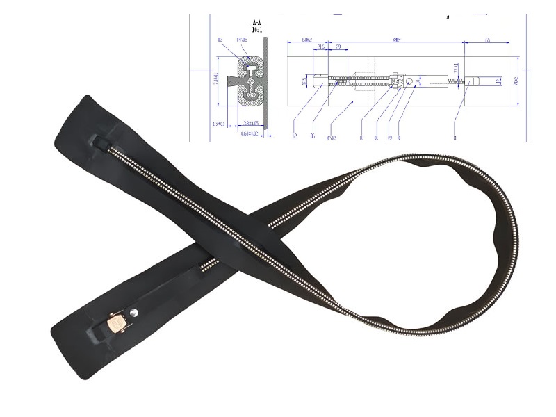 采用高强度氯丁橡胶布与合金铜齿牙,在拉链闭合时橡胶片相互密贴产生可靠的密封效果,坚固耐用,应用在各类潜水服、减压服等防水部件。